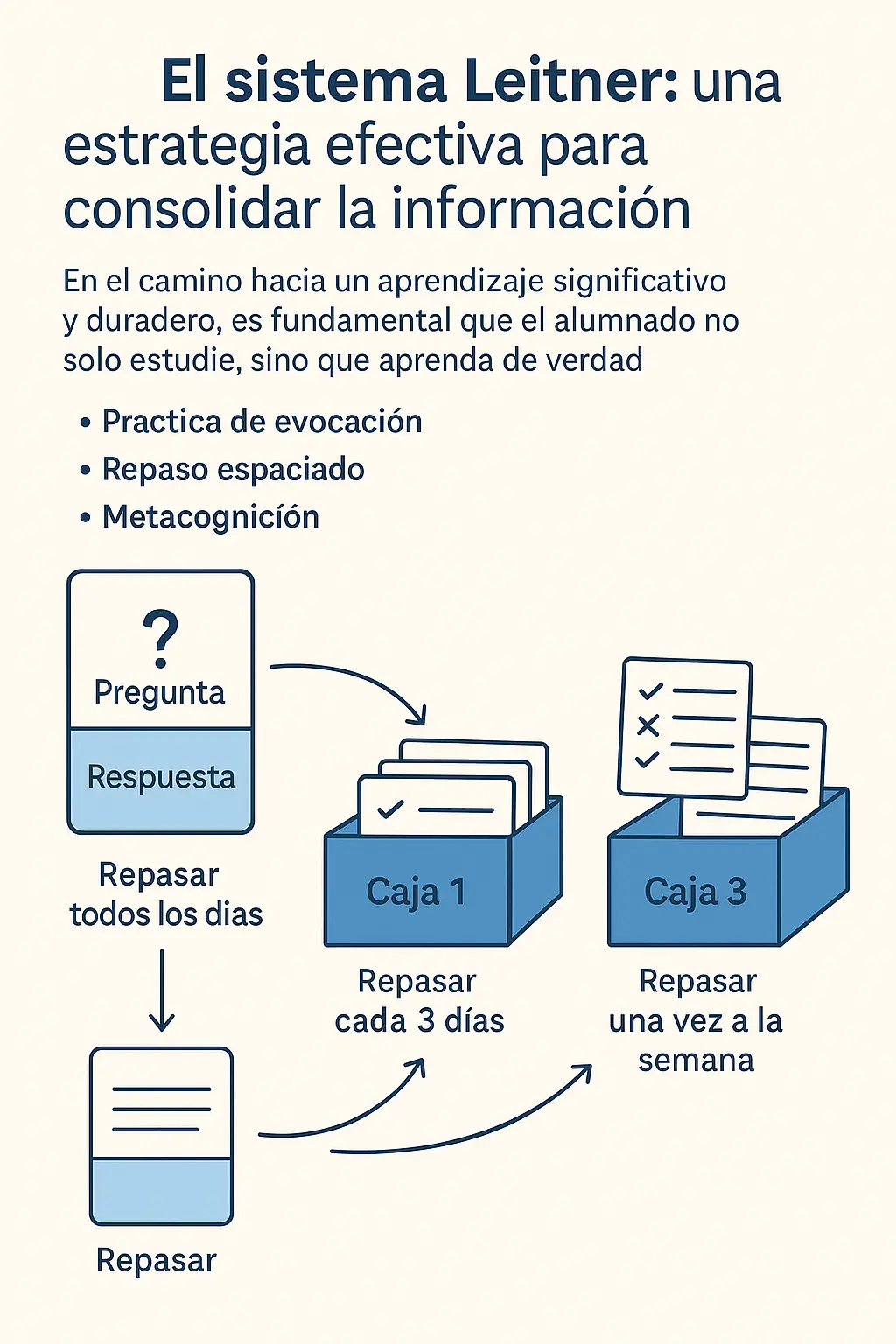 El sistema Leitner combina ambas técnicas de manera brillante. Se trata de un método simple, visual y flexible, que permite organizar los repasos de forma estratégica y adaptada al ritmo de cada estudiante.